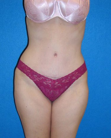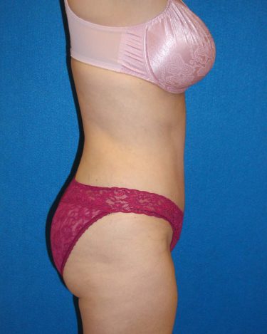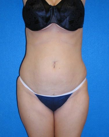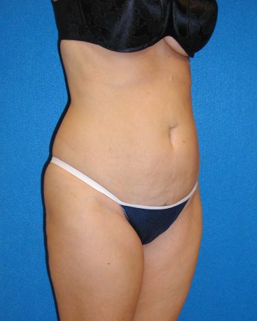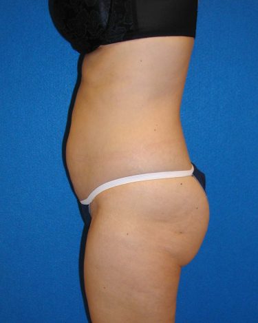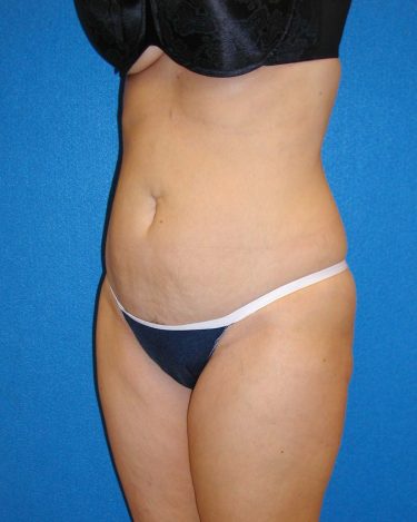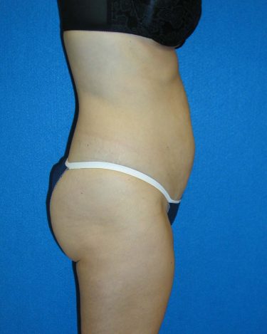 This 42-year-old female patient was dissatisfied with her abdominoplasty performed by another surgeon. She had significant rectus diastasis and excess fatty tissue around her abdomen. She elected to undergo abdominoplasty with liposuction to her upper and lateral abdomen and flank areas.
