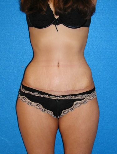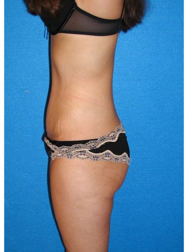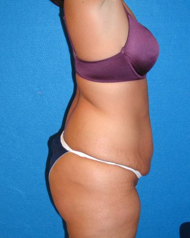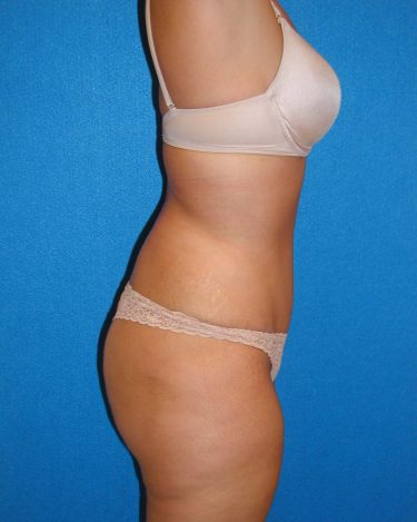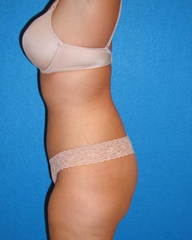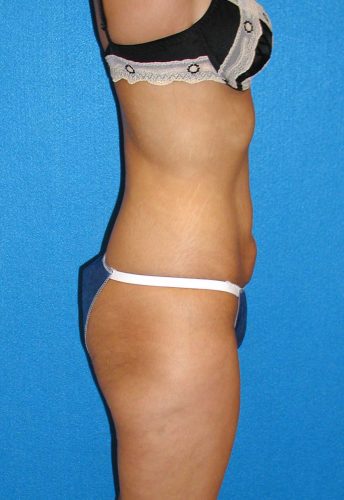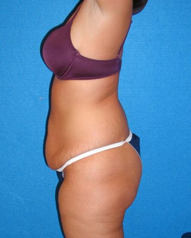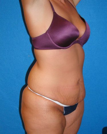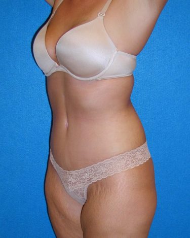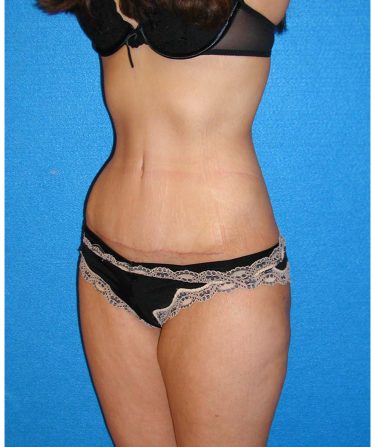 The patient is a 45-year-old mother of three. She wanted to correct the rectus diastasis and remove excess fatty tissue and skin around her abdominal area. Abdominoplasty with liposuction to her upper and lateral abdomen and flanks was performed.