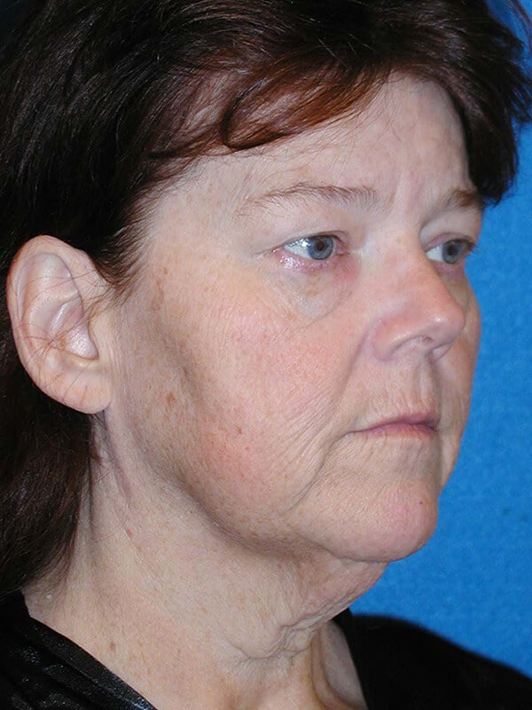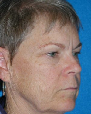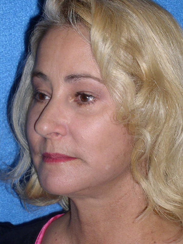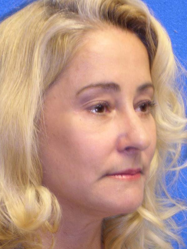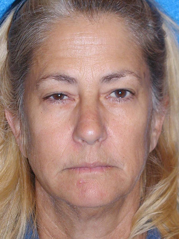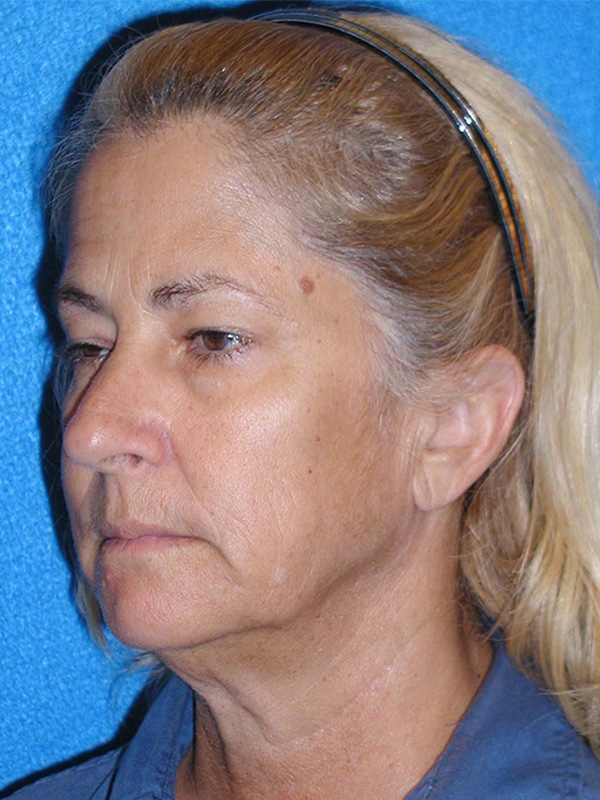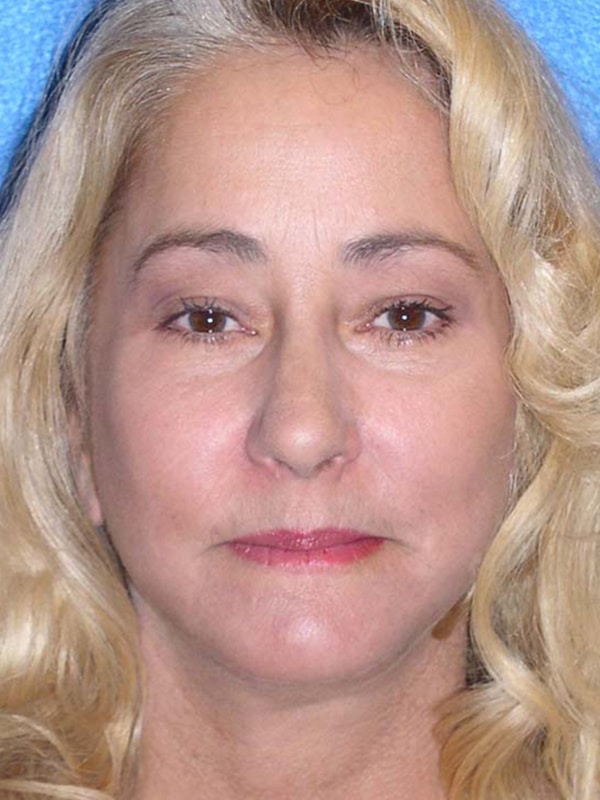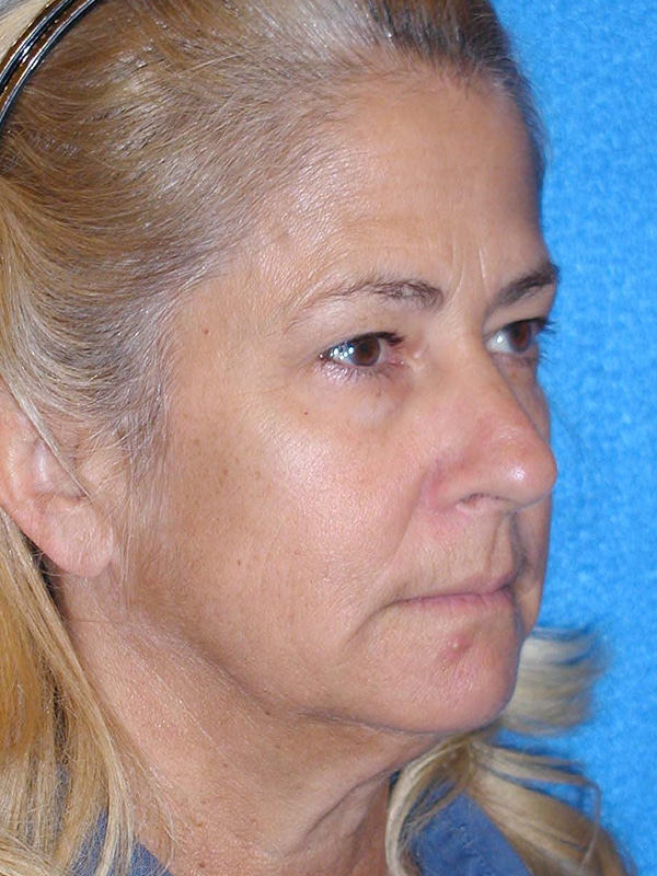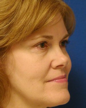 The patient is a 50-year-old female who underwent facial rejuvenation surgery to improve the position of her brow, correct jowling and sag, and improve the appearance of fine lines. A rhytidectomy, SMAS, platysmaplasty with endoscopic browlift and lower lid blepharoplasty was performed. Fat was removed from her abdominal area and transferred to the nasolabial folds and periorbital areas.