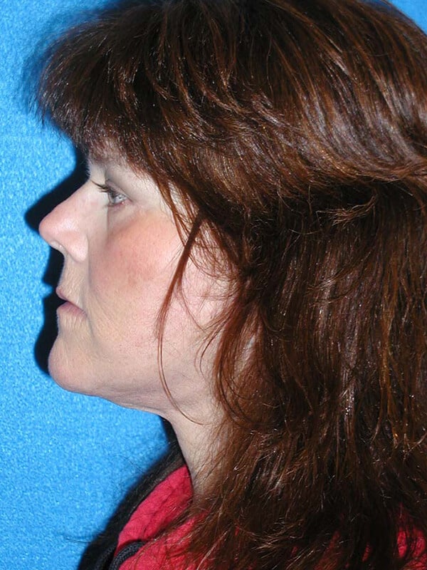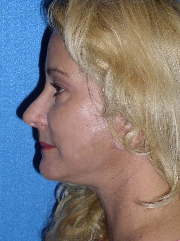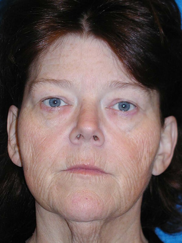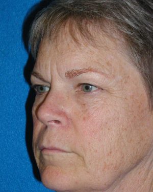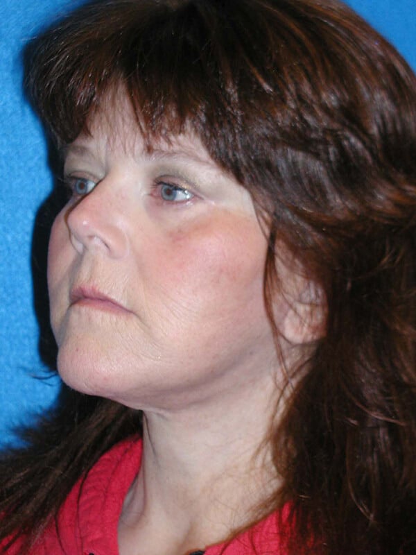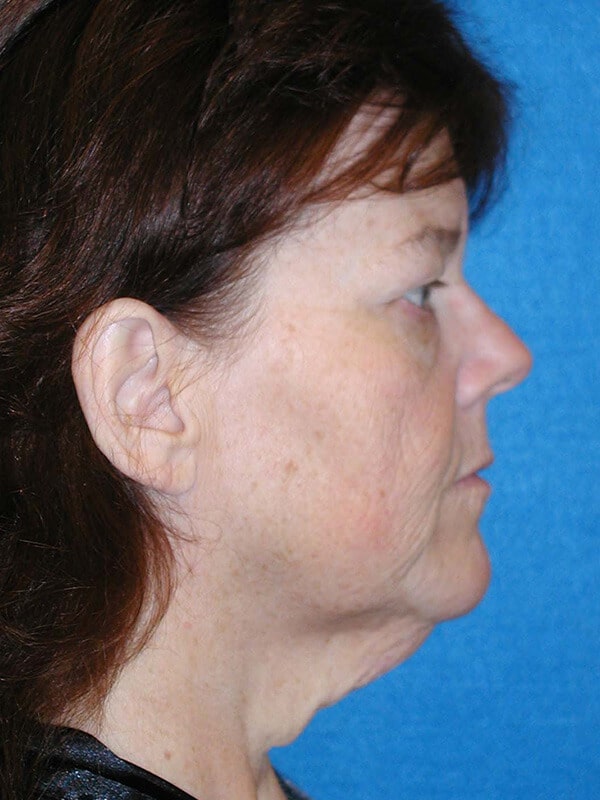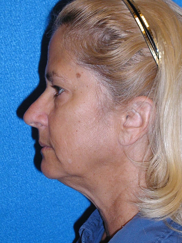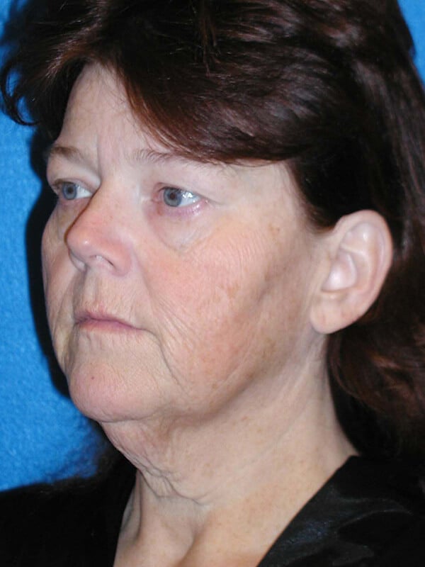The patient is a 50-year-old female who underwent facial rejuvenation surgery to improve the position of her brow, correct jowling and sag, and improve the appearance of fine lines. A rhytidectomy, SMAS, platysmaplasty with endoscopic browlift and lower lid blepharoplasty was performed. Fat was removed from her abdominal area and transferred to the nasolabial folds and periorbital areas.