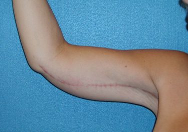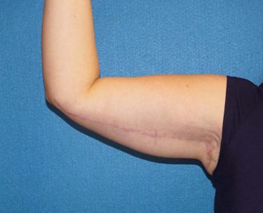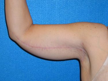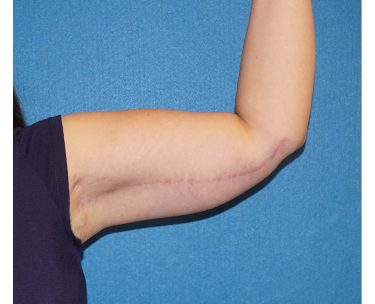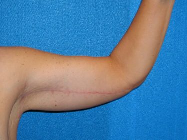 The patient is a 37-year-old with significant excess skin and fatty tissue on her upper arms. She underwent bilateral brachioplasty in which approximately 700 cc of fatty tissue was removed with liposuction and then excess skin was excised using the standard “T” style incision.
