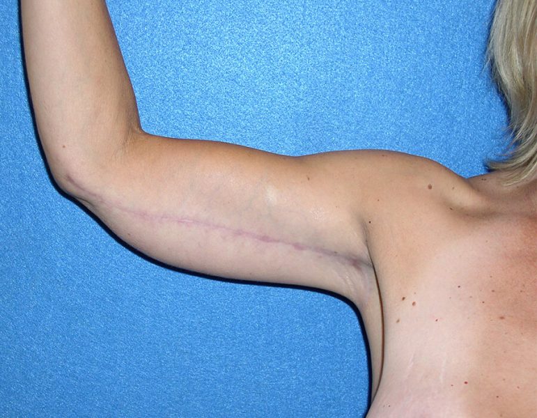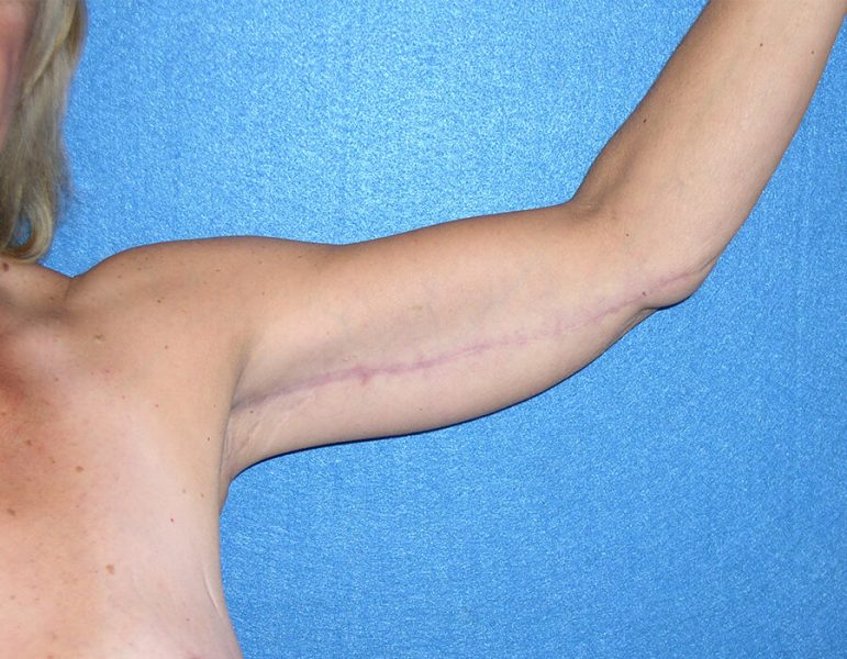 The patient is a 50-year-old female who has undergone gastric bypass surgery, which resulted in significant weight loss. She has undergone multiple procedures including abdominoplasty, thigh lift, breast mastopexy with augmentation, and brachioplasty. The brachioplasty was performed with a standard “T” type incision and approximately 200 cc of fatty tissue was removed through liposuction to the posterior tricep area.