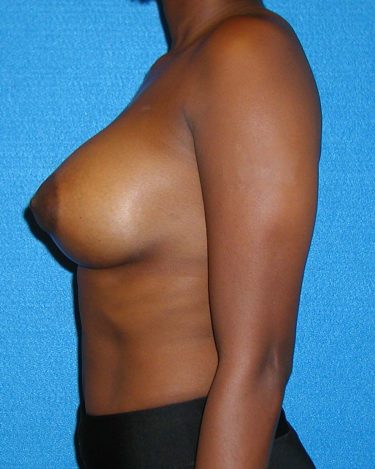 The patient is a 32-year-old wanting breast enhancement surgery. She was approximately a 34B-cup size and desired to be two to three cup sizes larger. Sizing was discussed and she elected to proceed with 400 cc silicone gel implants. Bilateral breast augmentation was performed using a periareolar incision and 400 cc smooth round high profile implants were placed under the pectoralis muscle.
