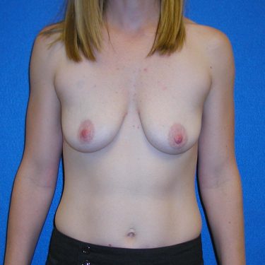 The patient is a 35-year-old wanting to undergo breast enhancement surgery. She wanted to enhance her breast size to a small C-cup. Bilateral 300 cc smooth round moderate plus profile silicone gel implants were placed under the pectoralis muscle using a periareolar incision.