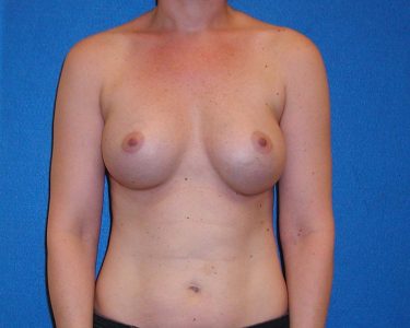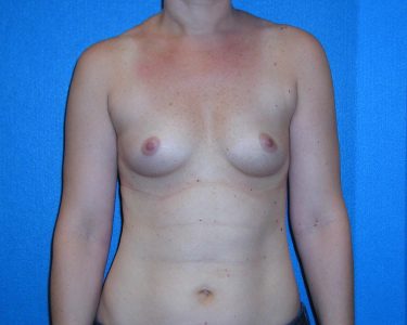 The patient is a 35-year-old wanting breast enhancement surgery to achieve a large C-cup to a small D-cup breast size. Bilateral 400 cc smooth round high profile implants were placed subpectorally with an inframammary fold incision.