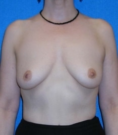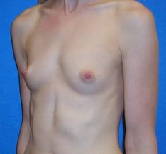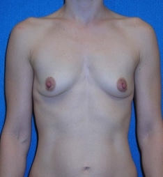 This patient’s preoperative examination revealed that she had good muscle development and very little fatty tissue below the skin. Because of this, I recommended for her to stay with a smaller- to medium-range implant in order to avoid an unnatural or obviously augmented appearance. This patient decided on saline implants, but because of her slenderness, silicone gel was also an appropriate option.