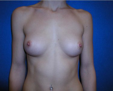 The patient is a 26-year-old wanting breast enhancement surgery. 380 cc smooth round high profile saline implants were placed and filled to 400 cc. Both implants were placed subpectorally with an inframammary fold incision.