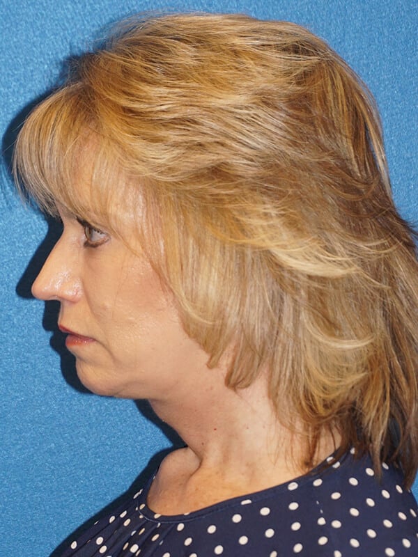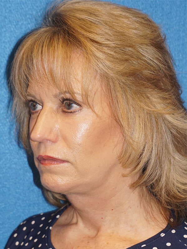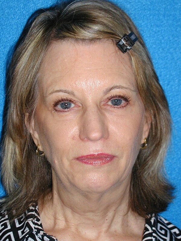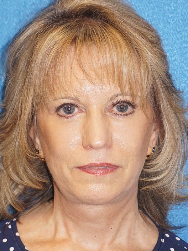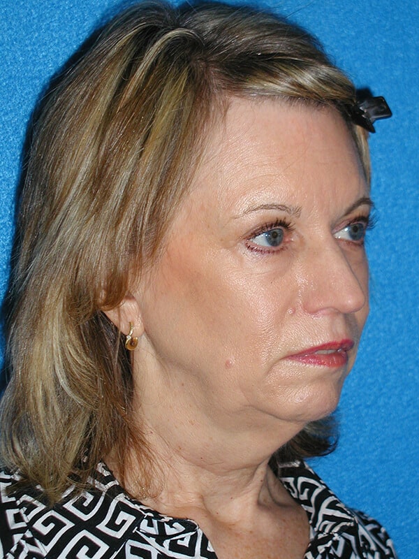 The patient is a 61-year-old wanting to improve her aging face and neck. She underwent rhytidectomy, SMAS, platysmaplasty, lower lid blepharoplasty, and removal of moles on her right cheek.