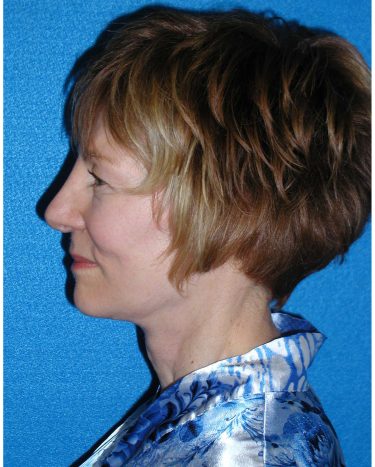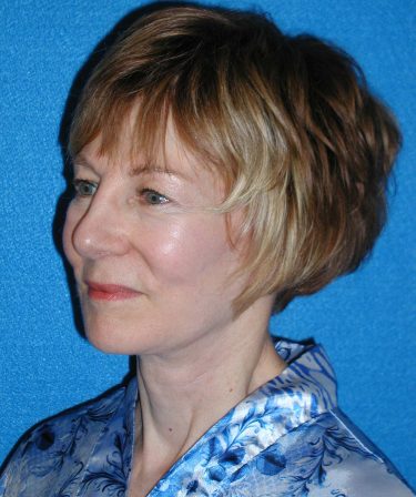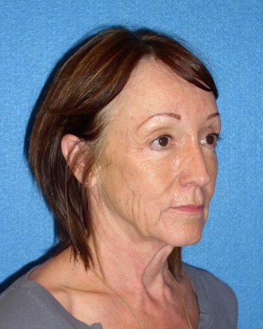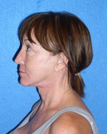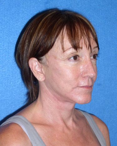 The patient is a 50-year-old female who underwent facial rejuvenation surgery to improve the position of her brow, correct jowling and sag, and improve the appearance of fine lines. A rhytidectomy, SMAS, platysmaplasty with endoscopic browlift and lower lid blepharoplasty was performed. Fat was removed from her abdominal area and transferred to the nasolabial folds and periorbital areas.