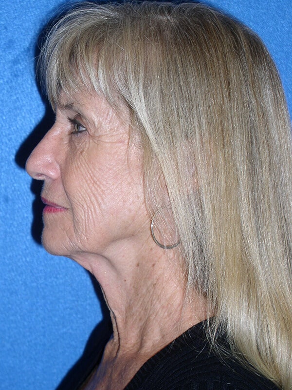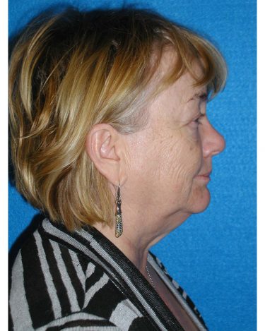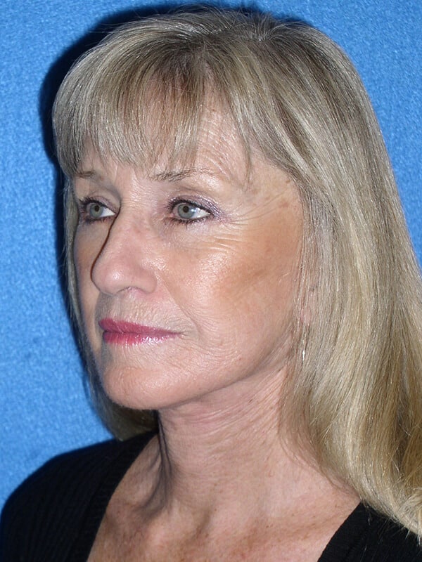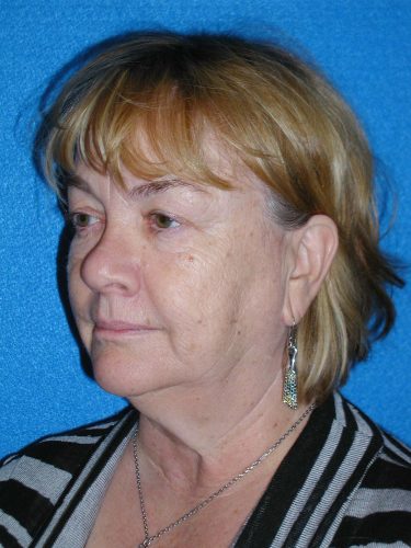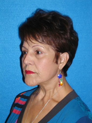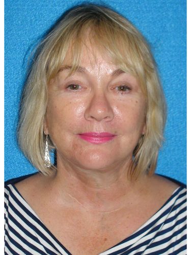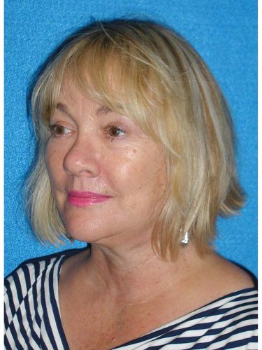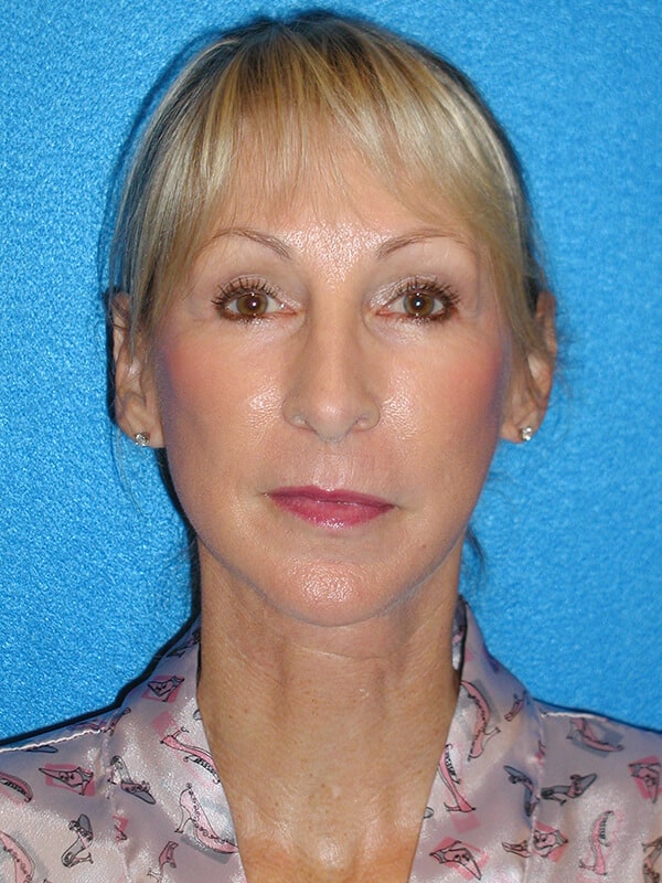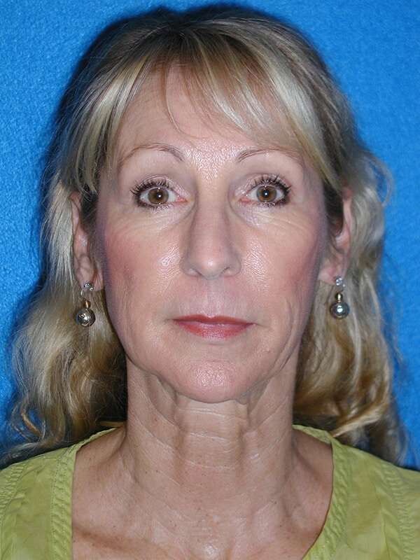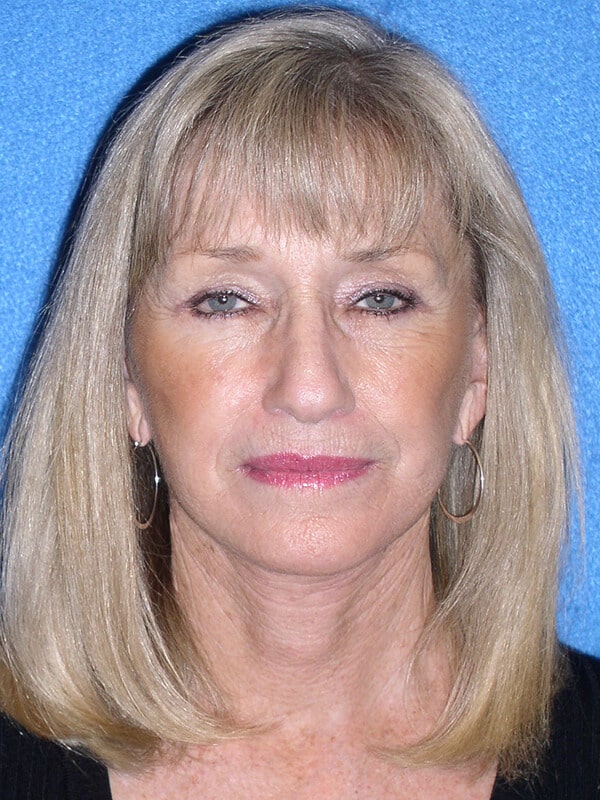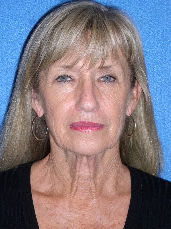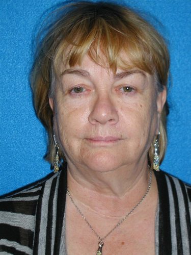 The patient is a 63-year-old female who wanted to improve the drooping and excess skin in her neck and face. She elected to undergo facial rejuvenation surgery which included a rhytidectomy, SMAS, platysmaplasty, corrugator resection through an endoscopic browlift, mid-facelift, and upper and lower lid blepharoplasty.