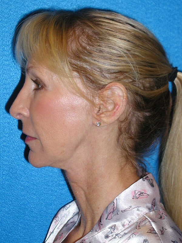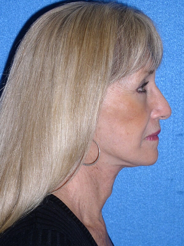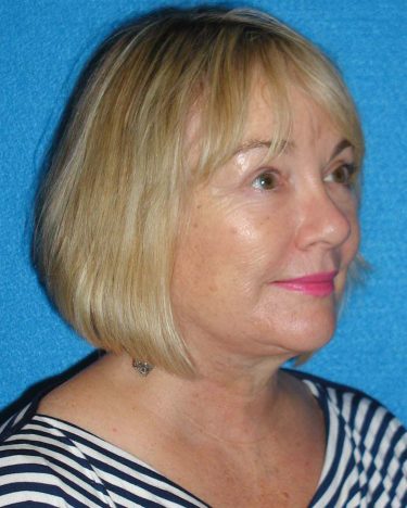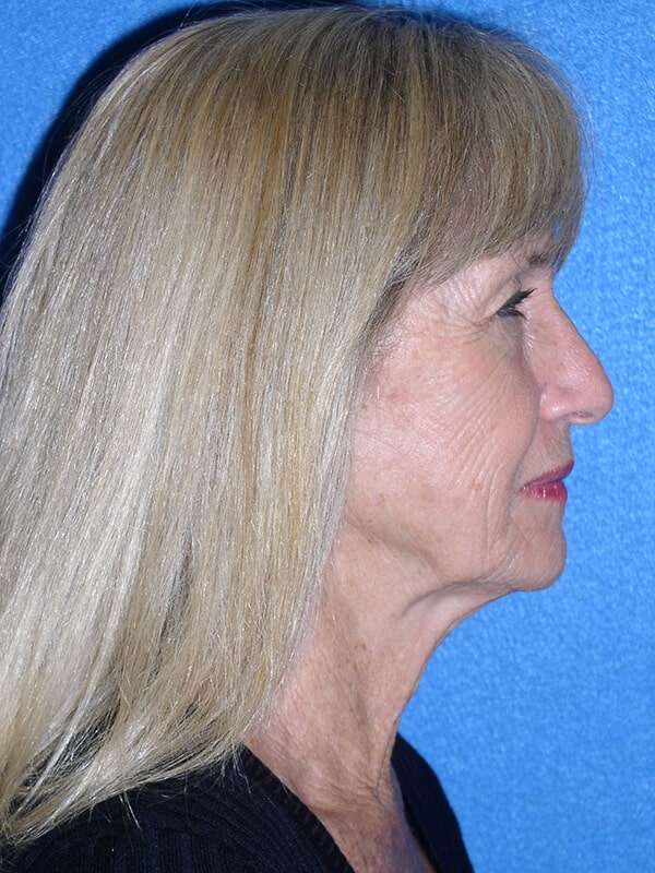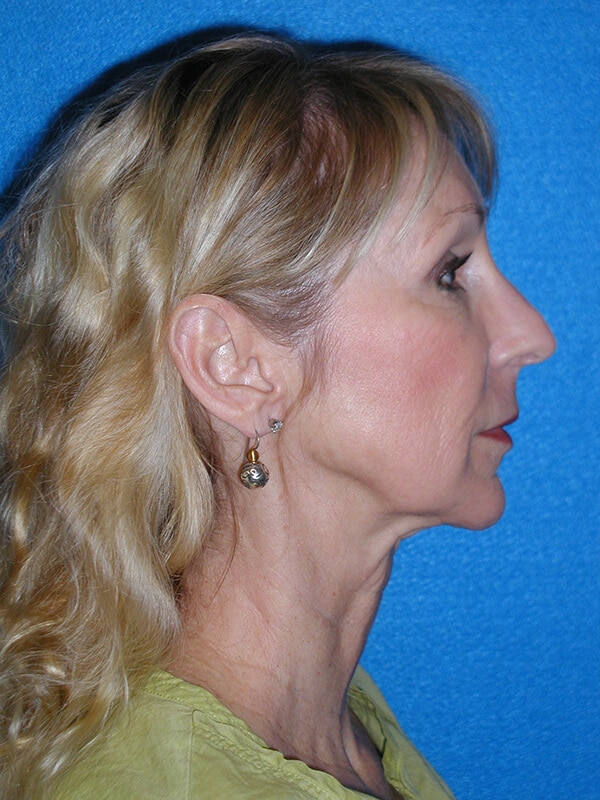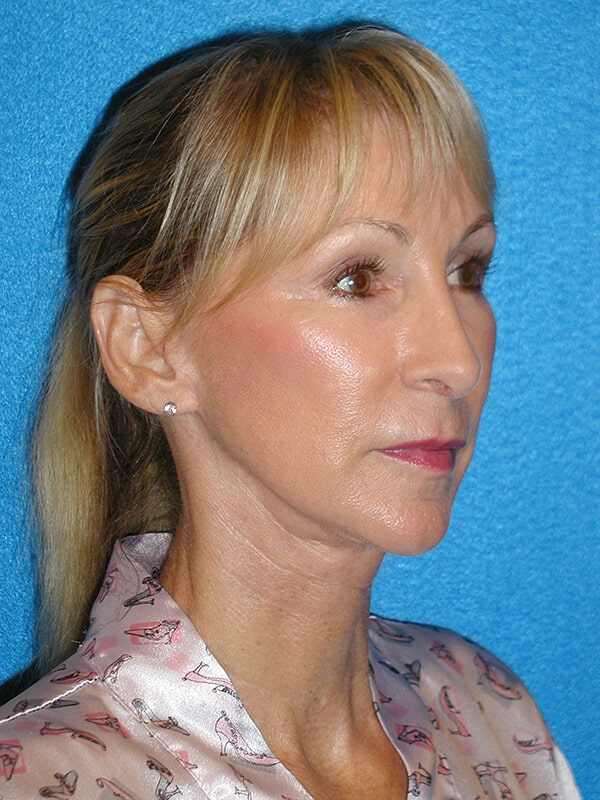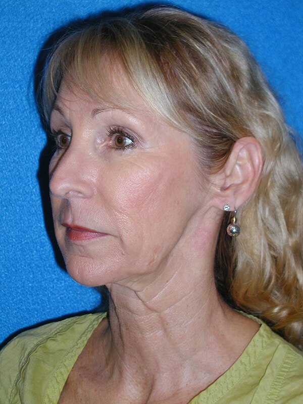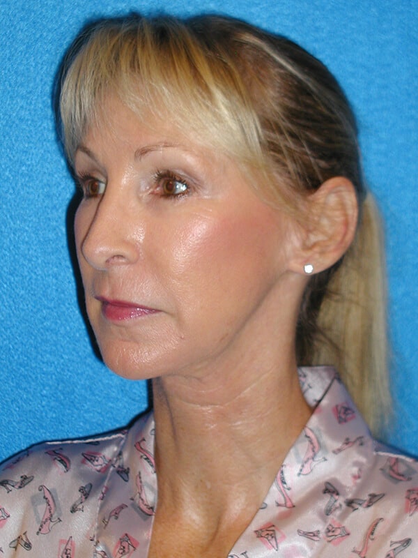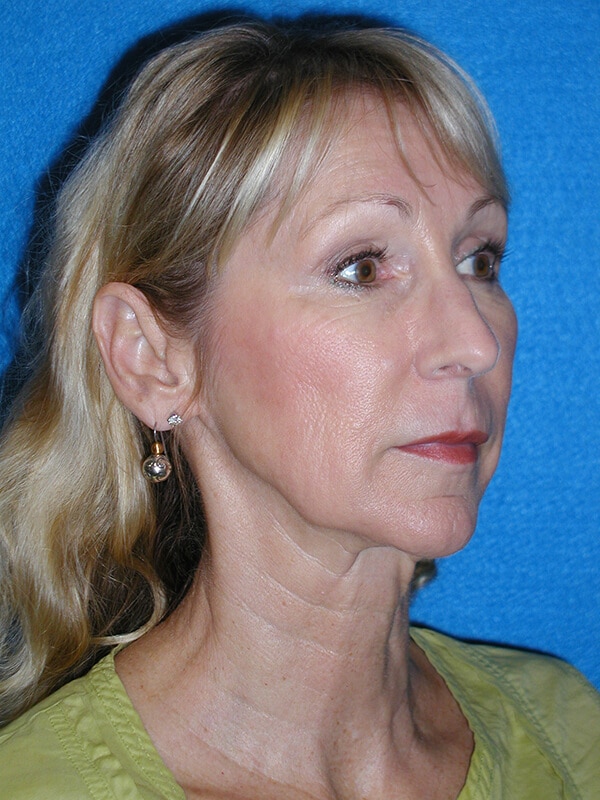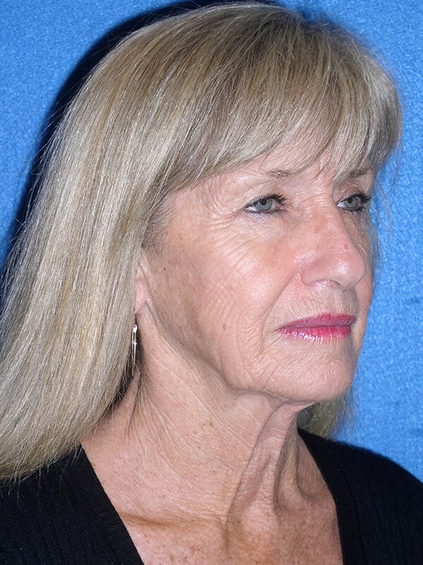 The patient is a 61-year-old wanting to improve her aging face and neck. She underwent rhytidectomy, SMAS, platysmaplasty, lower lid blepharoplasty, and removal of moles on her right cheek.