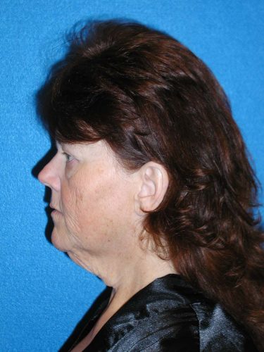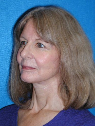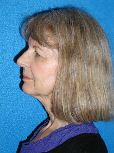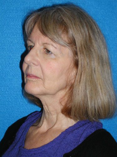 The patient is a 70-year-old female who wanted to improve her appearance by getting rid of excess skin around her eyes, jowls, and neck area. She had significant furrowing of her brows and therefore was recommended a browlift. She underwent facial rejuvenation which consisted of a rhytidectomy, SMAS, platysmaplasty, endoscopic browlift, and upper lid blepharoplasty. Fat was injected into the nasolabial folds, marionette lines, chin, and mid-face area.