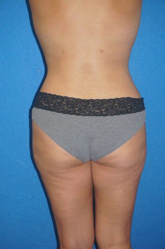 The patient is a 33-year-old wanting breast enhancement surgery. She underwent bilateral placement of 325 cc smooth round high profile implants under the pectoralis muscle with an inframammary fold incision.