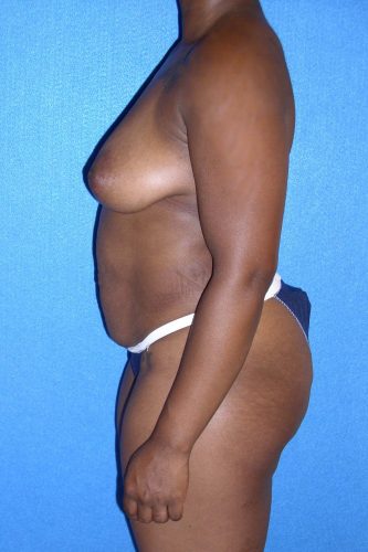 Given this patient’s significant lack of breast tissue, I suggested silicone implants which in my opinion offer definite advantages over saline for patients who have very little existing breast tissue. In her consultation I noted that after her weight loss, this patient’s abdominal muscles had separated slightly from each other, creating a small area of fullness in her lower abdomen and a fair amount of excess abdominal skin. She also had significant excess skin in the upper arm area. I performed a three-step procedure including breast augmentation and breast lift, abdominoplasty, and brachioplasty (arm lift).