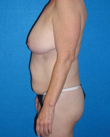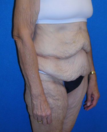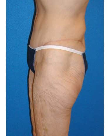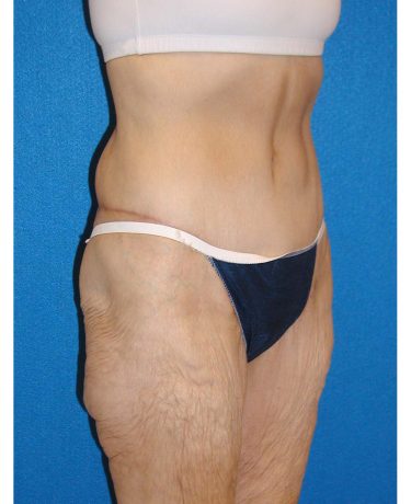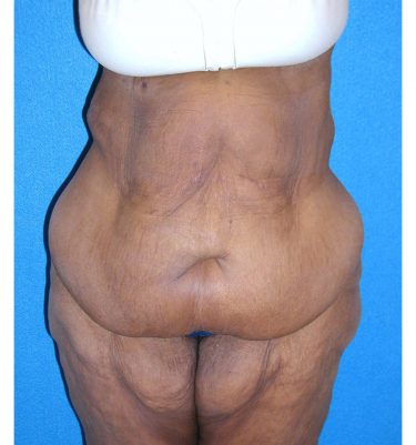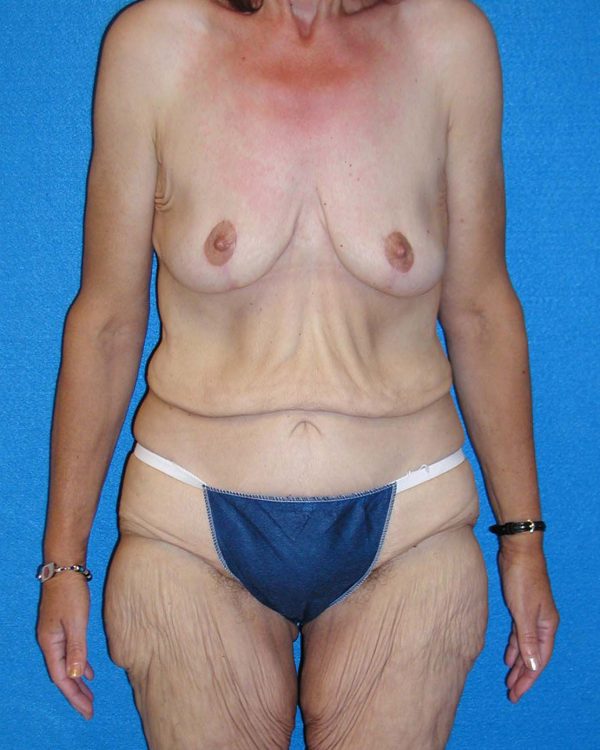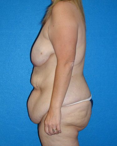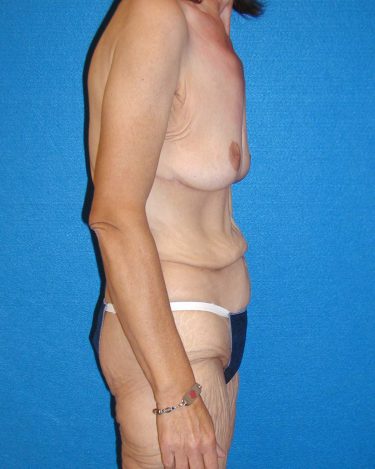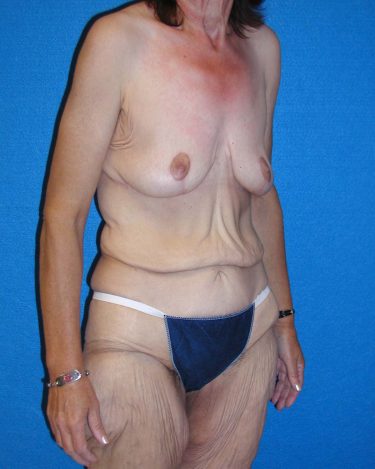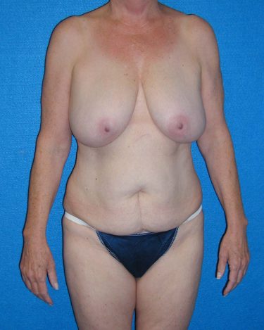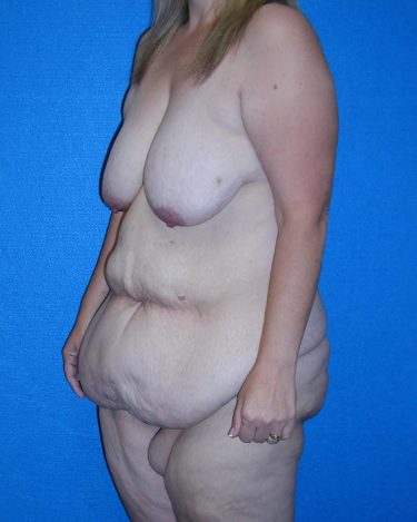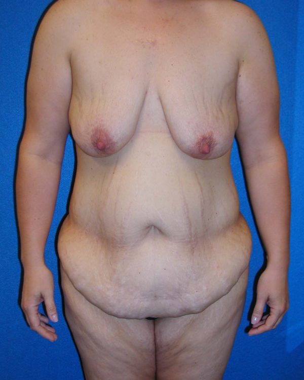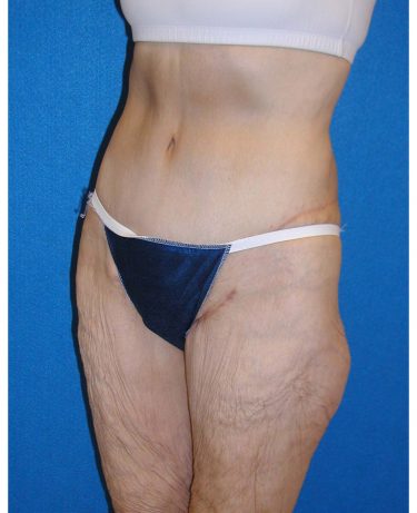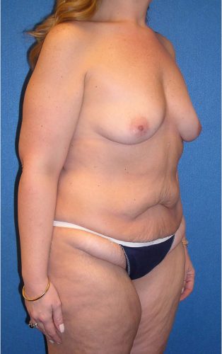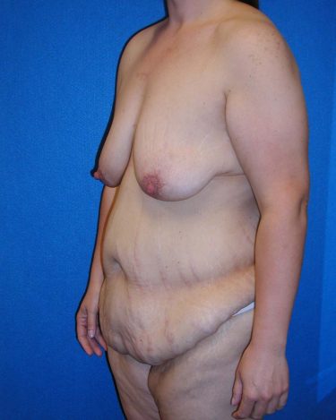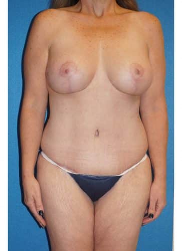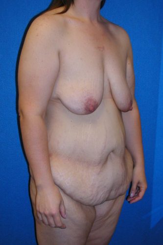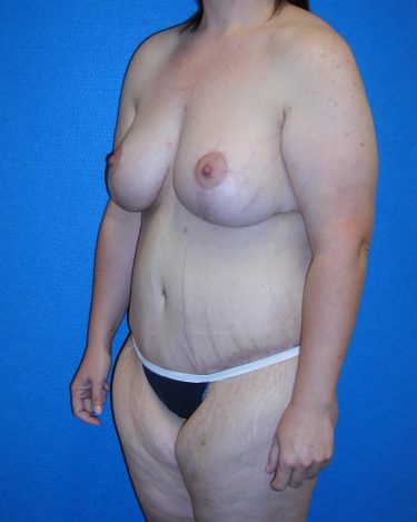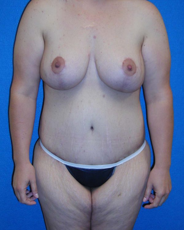 Patient has a history of 100lbs weight loss. She underwent an extended abdominoplasty with liposuction and a donut mastopexy with augmentation. Due to the asymmetry of her breasts, 300cc smooth round high profile silicone gel implant was placed on the right and 400cc smooth round high profile was placed on the left.