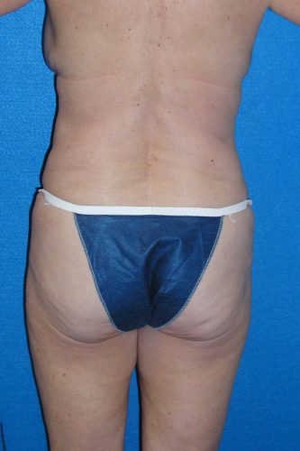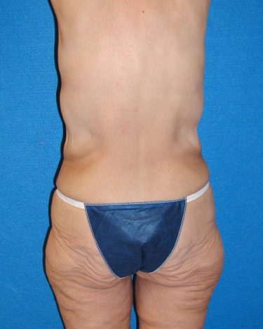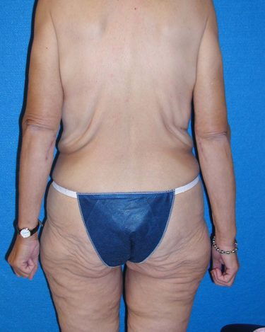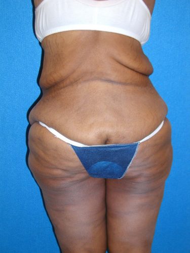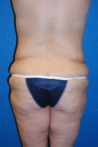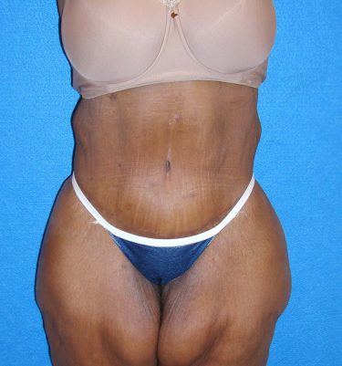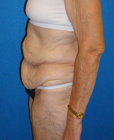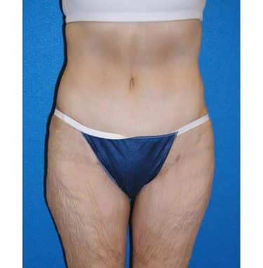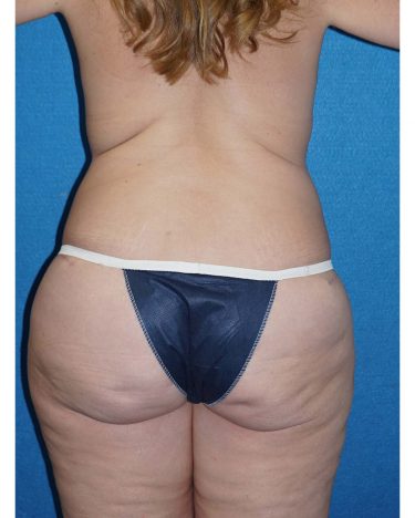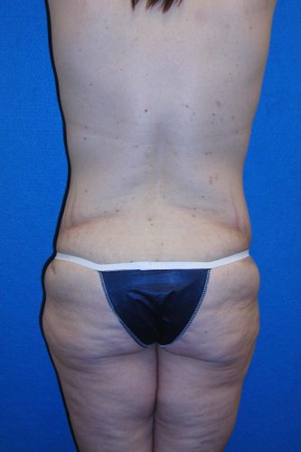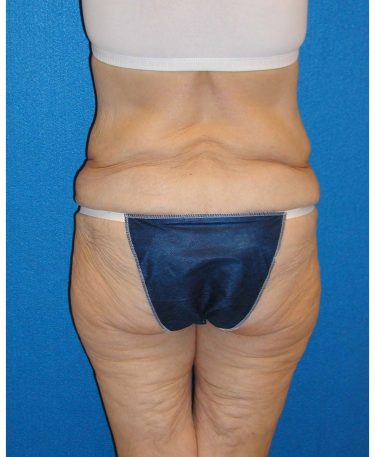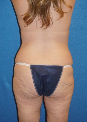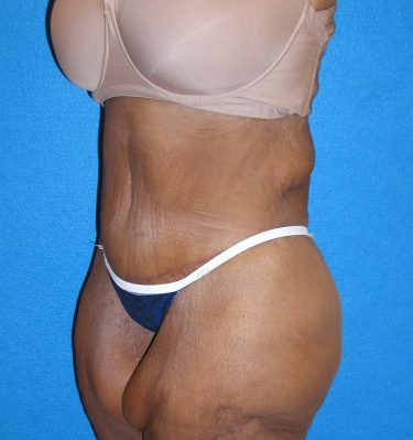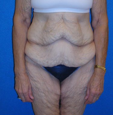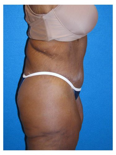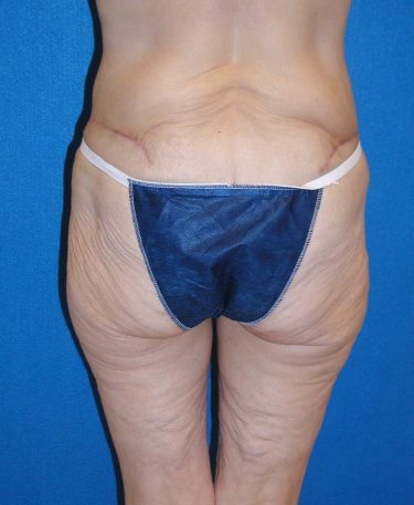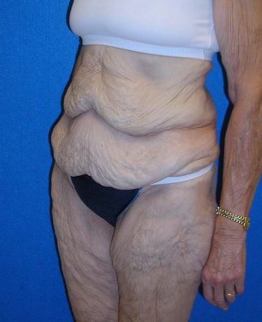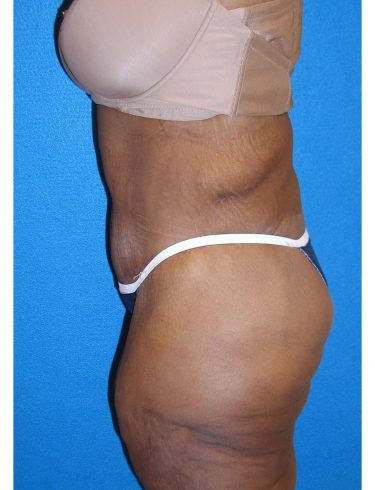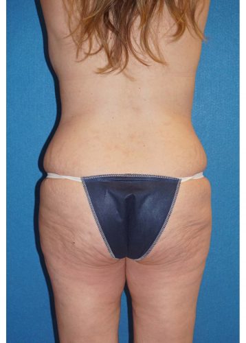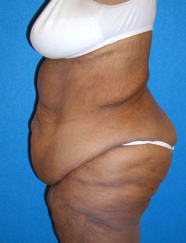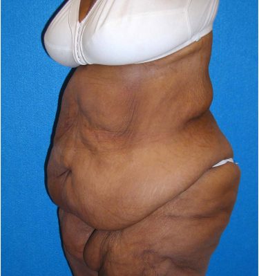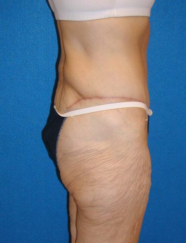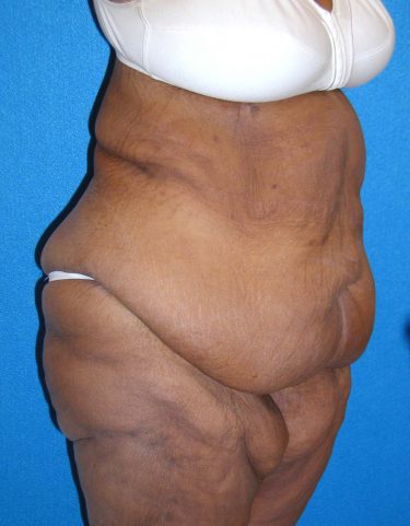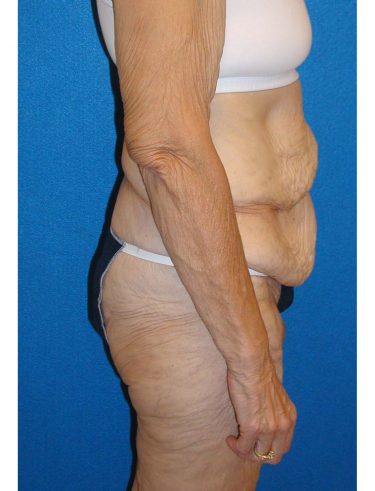 Patient has a history of 100lbs weight loss. She underwent an extended abdominoplasty with liposuction and a donut mastopexy with augmentation. Due to the asymmetry of her breasts, 300cc smooth round high profile silicone gel implant was placed on the right and 400cc smooth round high profile was placed on the left.